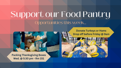 Tonight, we will meet at 5:30 pm in Room 151 to pack boxes for our Food Pantry's Thanksgiving distribution. Dinner will be provided - bring the whole family!